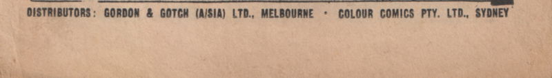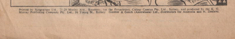 Printed by Sungravure Ltd., 21-29 Moreley Ave., Rosebery, for the Proprietors, Colour Comics Pty. Ltd., Sydney, and produced by the K. G. Murray Publishing Company Pty. Ltd., 56 Young St., Sydney. Gordon & Gotch (Australasia) Ltd., distributors for Australia and N. Zealand.