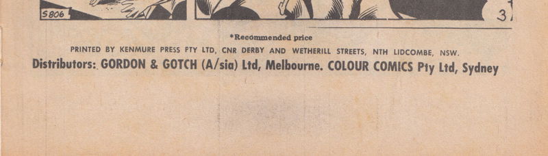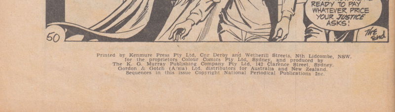 Printed by Kenmure Press Pty Ltd, Cnr Derby and Wetherill Streets Nth Lidcombe, NSW, for the Proprietors Colour Comics Pty Ltd, Sydney, and produced by The K. G. Murray Publishing Company Pty Ltd, 142 Clarence Street, Sydney. Gordon & Gotch (A/sia) Ltd, distributors for Australia and New Zealand. Sequences in this issue Copyright National Periodical Publications Inc.