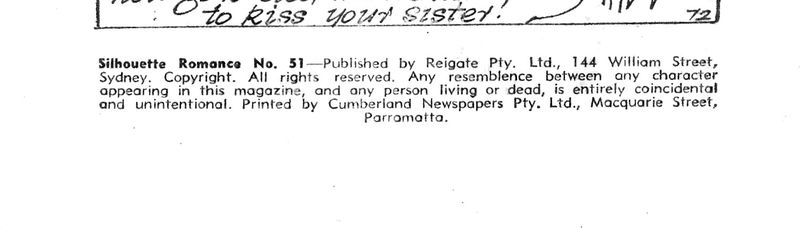Silhouette Romance No. 51 -- Published by Reigate Pty. Ltd., 144 William Street, Sydney. Copyright. All rights reserved. Any resemblence between any character appearing in this magazine, and any person living or dead, is entire.y coincidental and unintentional. Printed by Cumberland Newspapers Pty. Ltd., Macquarie Street, Parramatta.