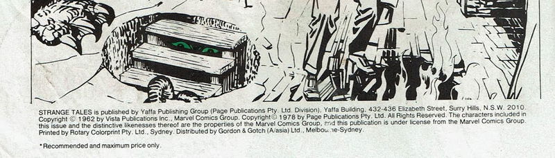 Strange Tales is published by Yaffa Publishing Group (Page Publications Pty. Ltd. Division), Yaffa Building, 432-436 Elizabeth Street, Surry Hills. N.S.W. 2010. Copyright © 1962 by Vista Publications Inc., Marvel Comics Group. Copyright © 1978 by Page Publications Pty. Ltd. All rights reserved. The characters included in this issue and the distinctive likenesses thereof are the properties of the Marvel Comic sGroup, and this publication is under license from the Marvel Comics Group. Printed by Rotary Colorprint Pty. Ltd., Sydney. Distributed by Gordon & Gotch (A/asia) Ltd., Melbourne-Sydney.