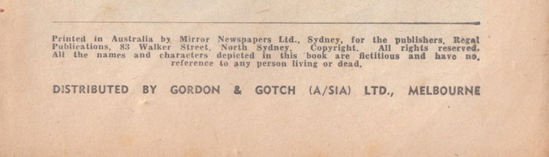 Printed in Australia by Mirror Newspapers Ltd., Sydney, for the publishers, Regal Publications, 83 Walker street, North Sydney. Copyright. All rights reserved. All the names and characters depected in this book are fictitious and have no reference to any person living or dead. Distributed by Gordon & Gotch (A/sia) Ltd., Melbourne.