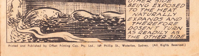 The small format and use of dull grey paper reflect post-war newsprint shortages and rationing in Australia. The comic has a single staple in the middle of the spine.